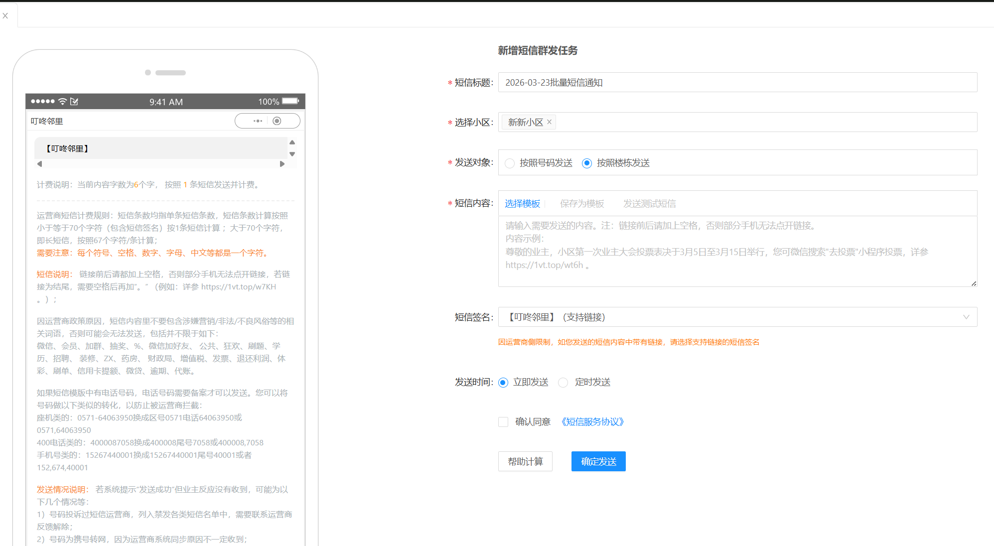 # 一、功能介绍 您可以在当前页面进行选择业主进行短信通知。 功能路径:服务通知 -》短信通知 -》短信发送。 # 二、如何发送短信 * **短信标题**:修改短信标题。 * **选择小区**:选择需要发送短信的小区,一次可以选择多个小区。 * **发送对象**: * 按照号码发送:需要手动输入手机号,多个手机号使用逗号隔开。 * 按照楼栋发送:勾选相应的楼栋住户。 * **短信内容**:请输入短信内容,一些短信内容的注意事项请查看左侧手机预览中的文字说明。 * **帮助计算**:可以查看本次发布任务预计使用资源数量。
