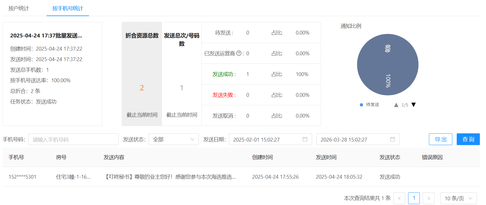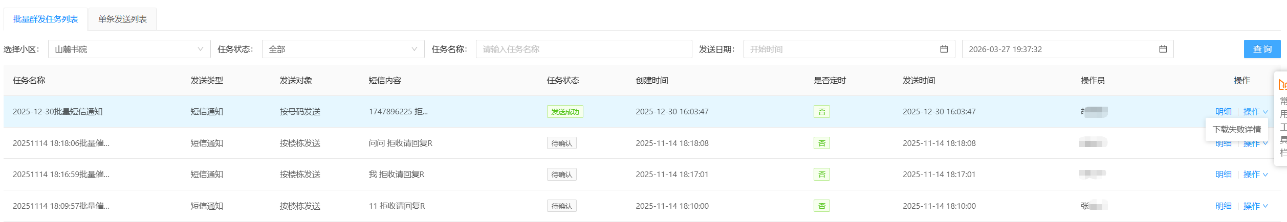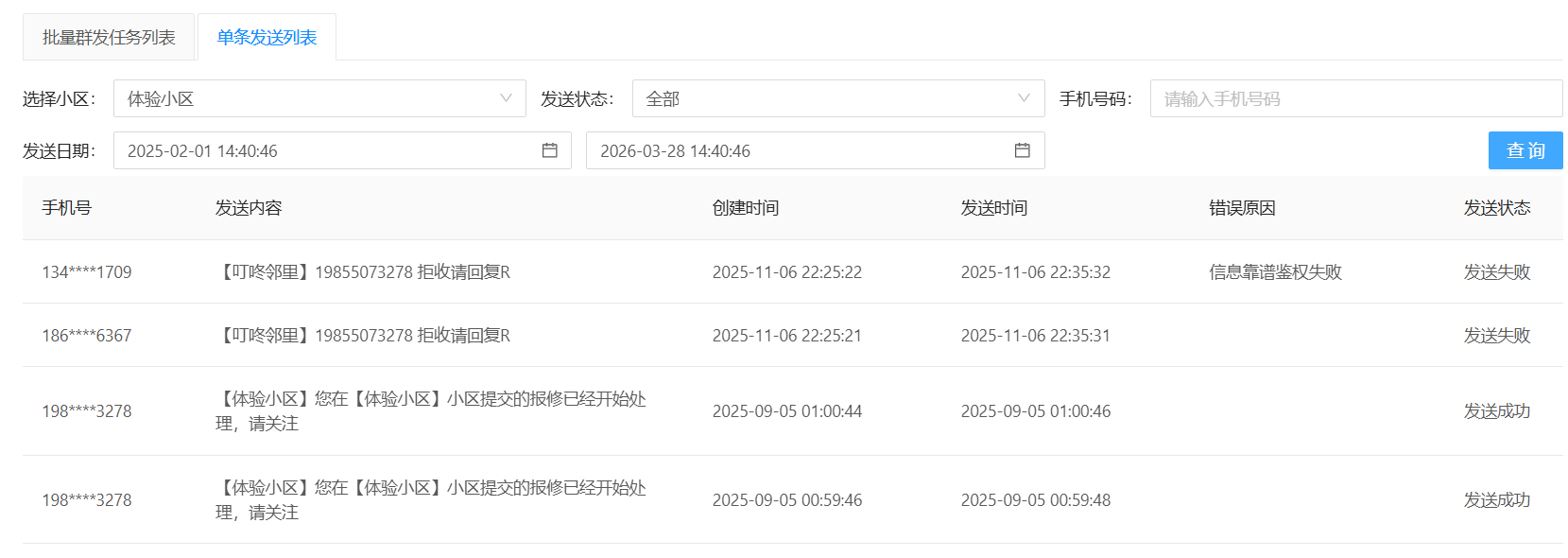 # 一、功能介绍 短信发送完毕后,可以在当前页面查看每次任务发送的具体情况。 功能路径:服务通知 -》短信通知 -》短信查询。 # 二、查询短信发送情况 ### (一)批量群发任务列表: * 选择【批量群发任务列表】→【选择小区】→ 选择【任务状态】→ 选择【发送日期】→ 点击【查询】→ 选择对应的发送记录 → 点击【明细】查看具体的发送情况。  --- * 点击**明细**可以查看短信发送的具体情况,包括已发送运营商、发送成功、发送失败等具体数量和占比,也可以输入手机号码查询单条发送情况。  --- * 如有发送失败的信息,点击**操作**,可以失败重发,也可以下载失败详情。  --- ### (二)单条发送列表: 选择【单条发送列表】→【选择小区】→ 输入需查询的【手机号码】→ 选择【发送日期】→ 点击【查询】。