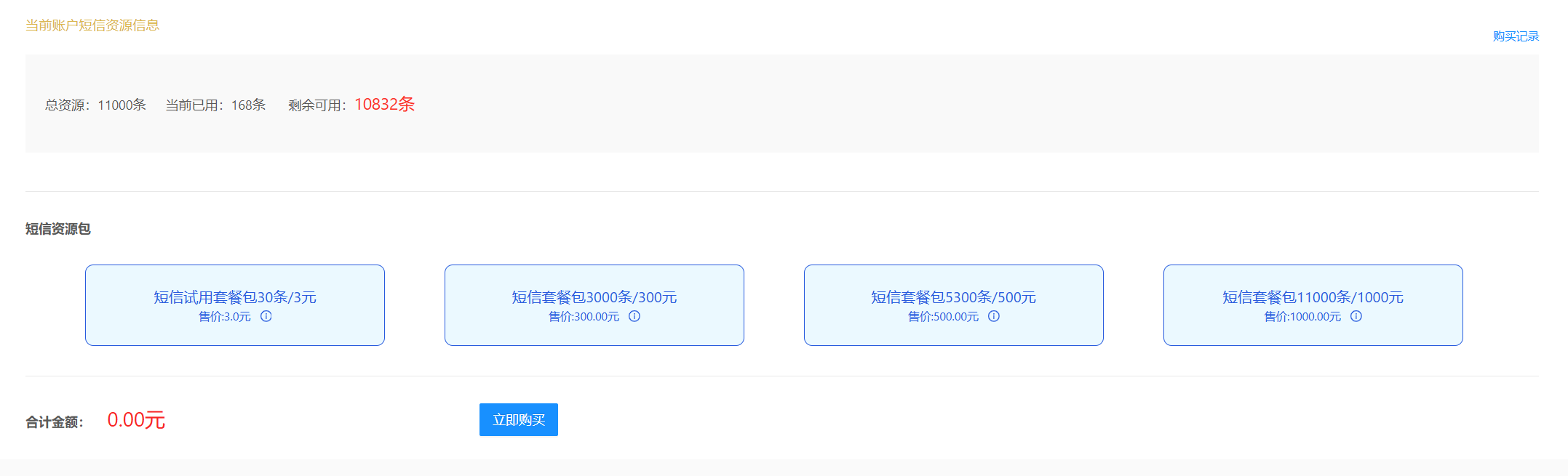 # 一、功能介绍 在当前页面可以查看 当前账户短信资源,购买短信资源包,查看购买记录。 功能路径:服务通知 -》短信通知 -》资源购买。