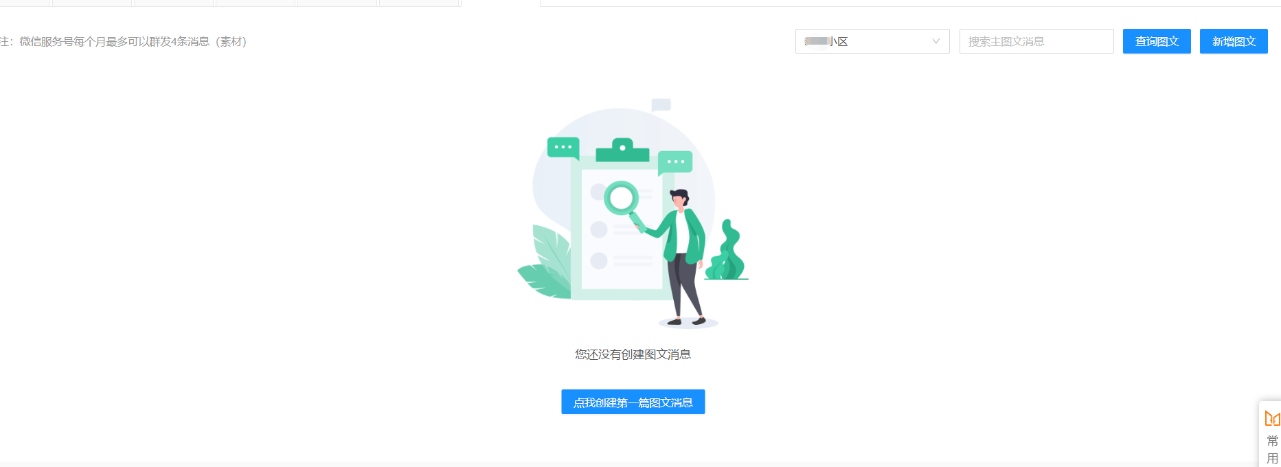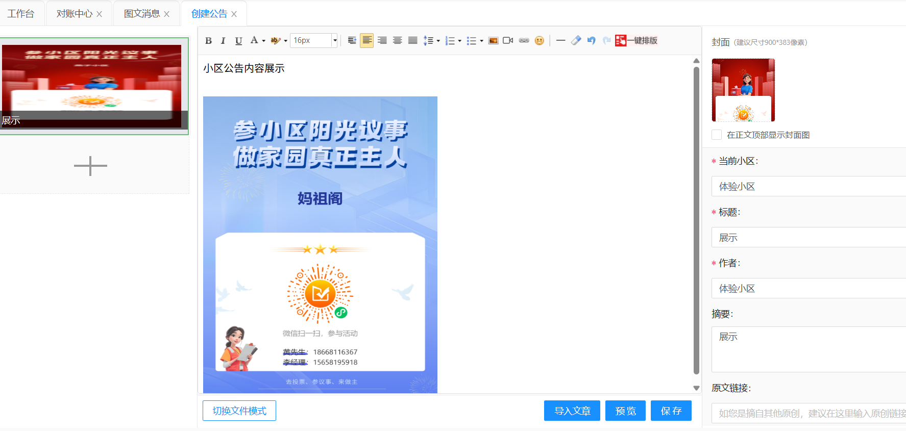 # 一、功能介绍 您可以在当前页面查看并管理公告。 功能路径:服务通知 -》微信公众号 -》图文消息。 # 二、新增图文 选择小区 → 点击【新增图文】→ 选择公告编辑模式 → 上传公告/附件 → 填写标题、作者、摘要 → 选择封面图片 → 点击【保存】→ 点击【发布】→ 选择【发布时间】和【到期时间】→ 点击【确定】。  --- **编辑模式** : * 富文本模式需要将公告转换成图片进行上传;  --- * 文件模式可直接将 PDF 档、word 档拖动到系统上或点击上传。  --- # 三、管理图文 ### 分享图文 点击图文下方的【分享】,获取H5 链接。 **H5 链接** :点击链接不需要跳转到小程序,可直接打开。 --- ### 下架/删除图文 点击图文下方的【取消发布】或【删除】。