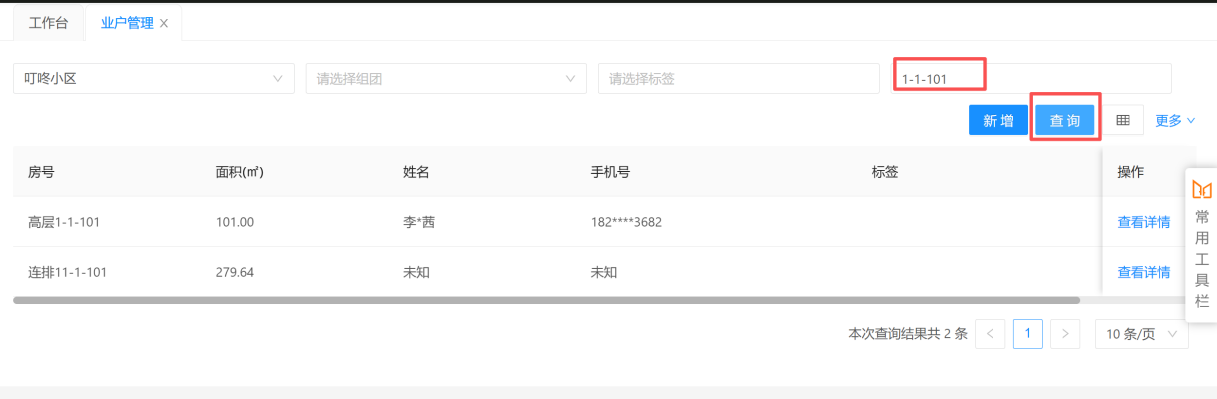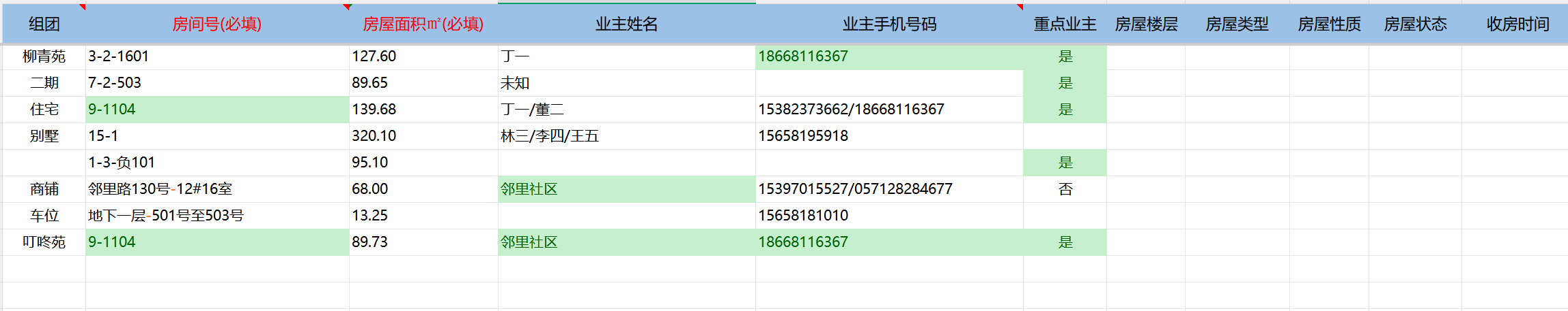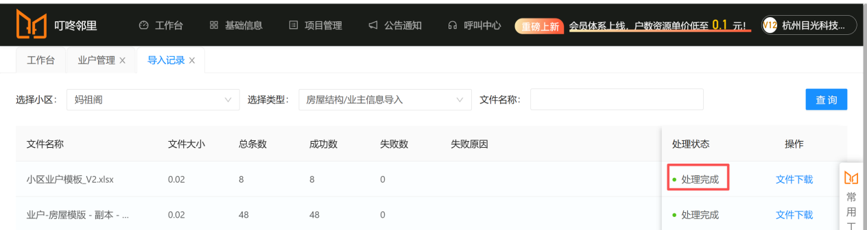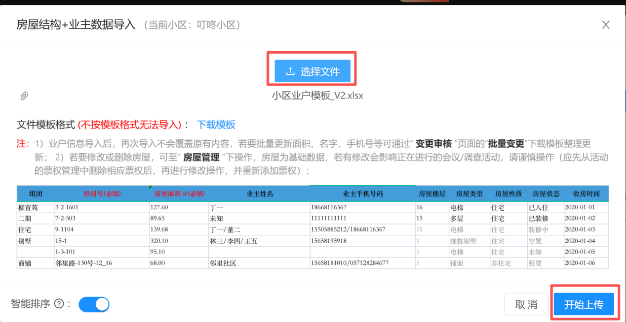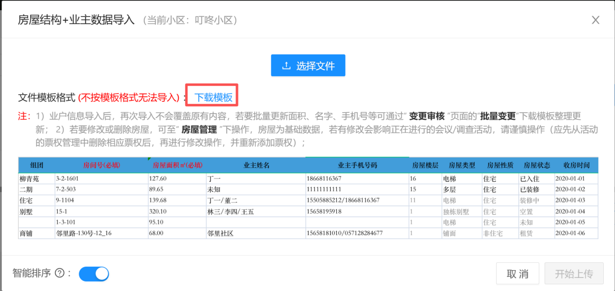 ### 导入业主信息 1. 点击【基础信息】进入【业户管理】;  --- 2. 搜索需导入业主信息的小区,点击【更多】选择【导入业主】;  --- 3. 选择【房屋结构 + 业主资料导入】此功能包含房号和业主信息,【房屋结构导入】此功能只包含房号;  --- 4. 点击【下载模版】。注意表格表头第一行内容不能修改,同时只能使用第一条 sheet 进行整理,需要将组团、房号、业主姓名、手机号码、面积整理到下载的模版里,如有个别业主需要标记的,可在“重点业主”这一列填写“是”;   --- 5. 模版整理完成点击【选择文件】进行导入,最后点击【开始上传】;   --- 6. 在【更多】-->【导入记录】里可查看导入情况。  --- 7. 业户管理页面会展示出此小区的业主信息,也可以根据房号/姓名/手机号码进行过滤查询。  ### 常见问题 **Q:** 房号怎么编辑? **A:** 格式为:楼栋/幢号-单元号-房号或楼栋/幢号-房号,注意“-”是用来区分层级结构(最少有一个最多两个“-”,若只有一个“-”,则单元为默认单元),例如: > 3 幢 2 单元 1601 室写成 3-2-1601; > 9 幢(默认单元)1104 室写成 9-1104; > 1 栋 3 单元地下 101 写成 1-3-负 101; > 别墅 15 幢写成 15-1 或别墅-15 号; > 邻里路 130 号写成邻里路-130 号; > 邻里路 130 号 12-16(12 号~16 号)写成邻里路-130 号-12_16 或邻里路-130 号-12#16 或邻里路 130 号-12 至 16 等; --- **Q:** 业主信息导入失败? **A:** 根据导入记录里的失败原因修改业主信息,修改完成后再重新进行导入一遍。(*注意*:业主信息导入模版的表头不可更改,不然会导入失败。)