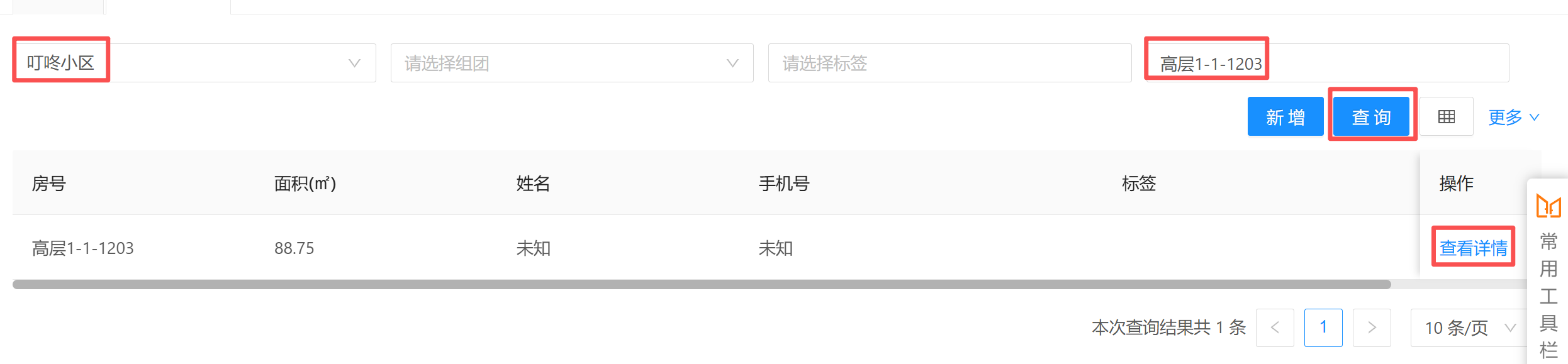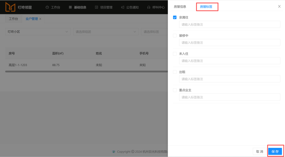 ### 标记重点业主 1. 点击【基础信息】进入【业户管理】;  --- 2. 搜索小区,输入需要标记的业主房号,点击【查询】,搜索出来后点击【查看详情】;  --- 3. 选择【房屋标签】,根据业主情况选择对应的标签,最后点击【保存】。