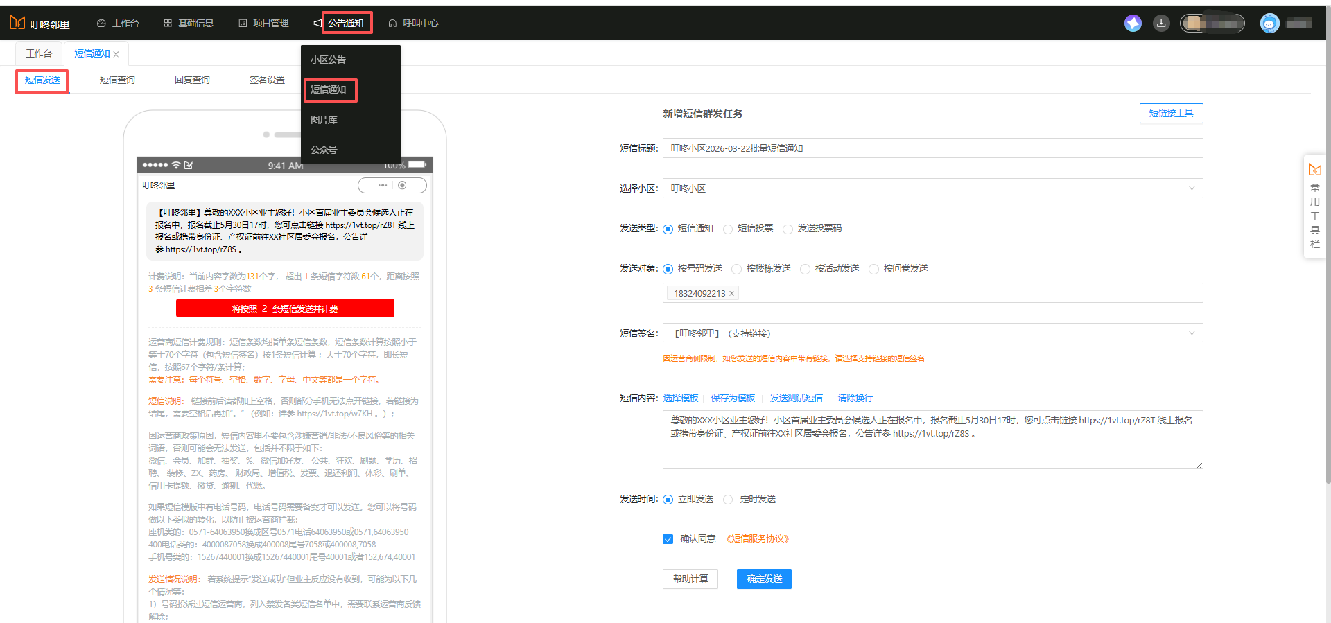 ### 适用场景 适用于发送意见征询、候选人报名、业主大会投票等通知类信息。 ### 发送短信通知 点击【短信通知】选择【短信发送】,【选择小区】→ 选择【短信通知】→ 选择【发送对象】→ 设置【短信签名】→ 添加【短信内容】→ 选择【发送时间】→ 选【短信服务协议】→【确定发送】。  * **短信标题** **:** 在页面选择小区后,系统将根据小区名称自动填入标题。也可以根据实际需求手动修改。说明:此标题仅用于后台查询与管理,不会显示在业主收到的短信内容中。 * **选择小区** **:** 点击下拉框,选择本次短信发送的目标小区。注意:请确认所选小区范围正确,系统将向该小区内的业主发送信息。 * **发送类型** **:** 选择短信通知。 * **发送对象:** 系统支持四种发送模式,请根据实际业务需求选择;1)按号码发送(需将发送号码输入/粘贴到发送框里,多个号码使用“/”隔开);2)按楼栋发送(可根据业务需求选择全体业主、指定楼栋或房号);3)按活动发送(可对未投票的业主进行发送催投短信);4)按问卷发送(可选择问卷调查对全体业主或未填写业主进行发送)。 * **短信签名:** 短信内容带有链接需要选择“叮咚邻里”,短信内容里无链接可选择“叮咚邻里”也可选择其他签名。 * **短信内容:** 首次发送需将内容粘贴到框内,发送成功后会自动生成模板,便于下次直接选择模板进行修改或发送,可在左侧查看本条短信是按几条计费的。 * **发送时间:** 可根据业务需求选择立即发送或定时发送。