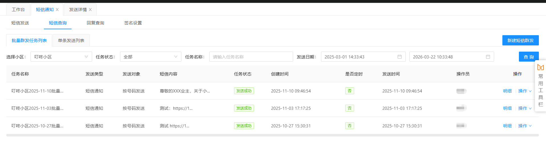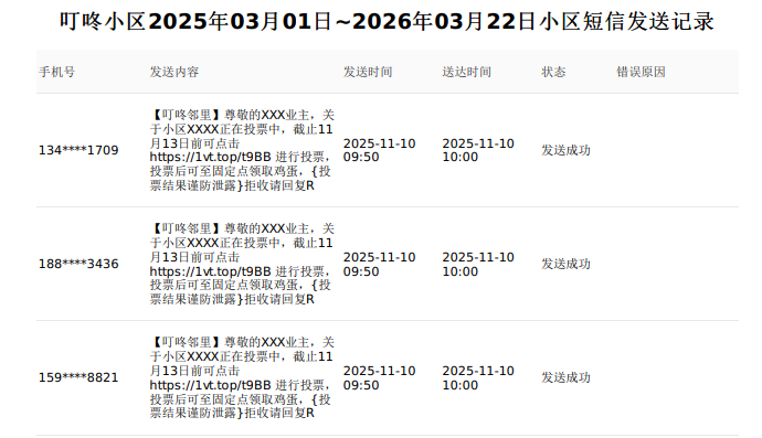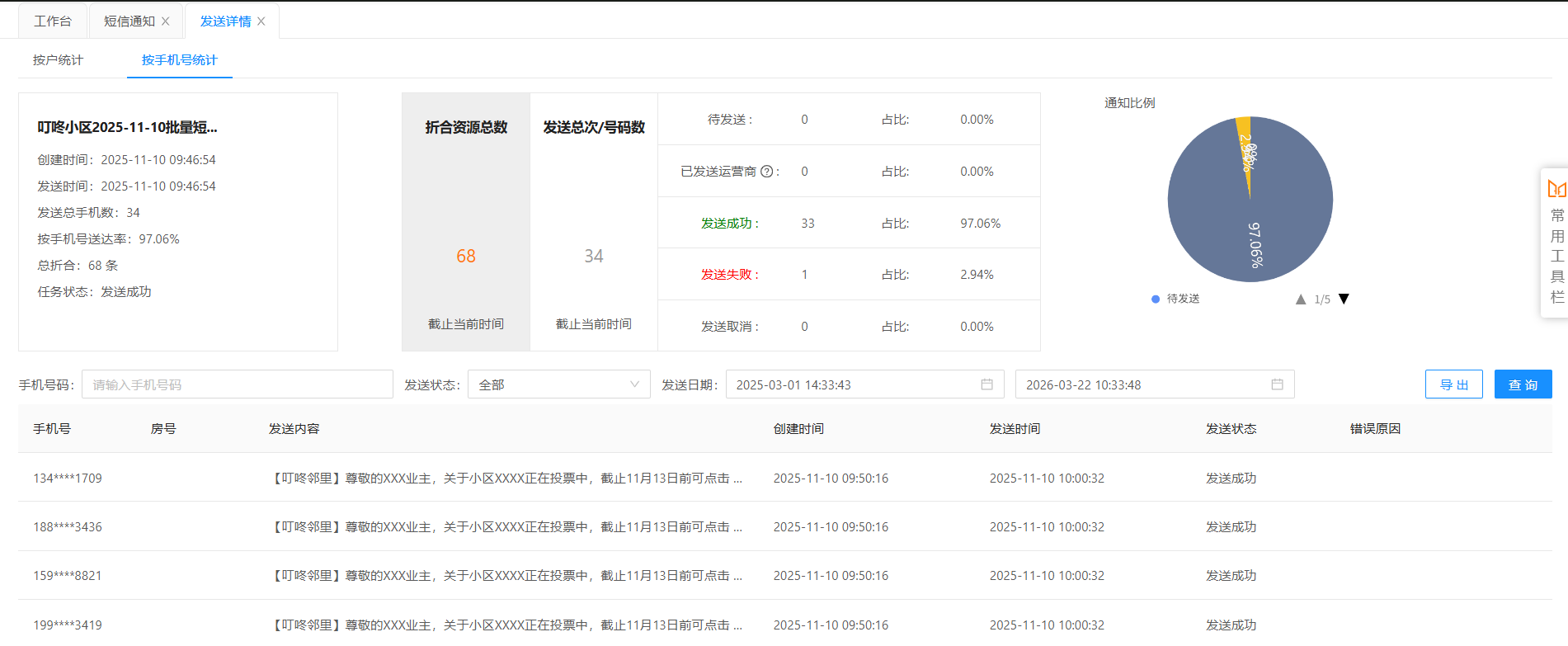 ### 功能介绍 短信批量发送完毕后,可以在此功能中查看每次任务发送的具体情况。 ### 查询短信发送情况 点击【短信通知】选择【短信查询】,选择【批量群发任务列表】→【选择小区】→ 选择【任务状态】→ 选择【发送日期】→ 点击【查询】→ 选择对应的发送记录 → 点击【明细】查看具体的发送情况。  --- 可以查看短信发送的具体情况,包括已发送运营商、发送成功、发送失败等具体数量和占比,也可以输入手机号码查询单条发送情况。  * 并且可以选择发送状态(发送成功、发送失败)进行导出。