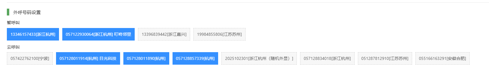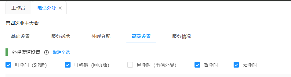 ### 功能介绍 此功能可以根据项目地区选择不同的外呼号码。 ### 外呼设置 1. 在【兼职服务】模块下,点击【电话外呼】,选择【高级设置】; 2. 勾选外呼渠道,未勾选的渠道在话务员选择外呼界面则不显示,外呼渠道分为**叮呼叫、通呼叫、智呼叫、云呼叫**等; `叮呼叫和通呼叫外显为 电信自备号和 运营商提供号码,智呼叫和云呼叫外显为 运营商提供的号码。`  --- 3. 外呼号码设置:选择号码会显示蓝色,取消号码选择显示为灰色。