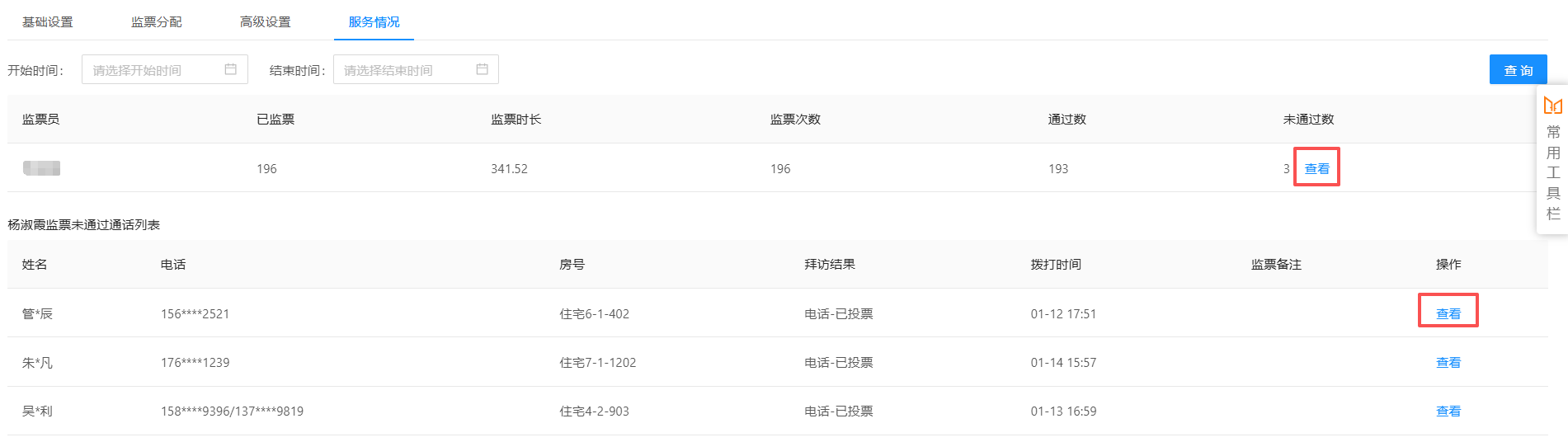 ### 外呼监票情况 在【兼职服务】模块下,点击【外呼监票】,选择【服务情况】; 可根据时间进行筛选,点击查看未通过的业主信息,也可再次听录音进行核实。