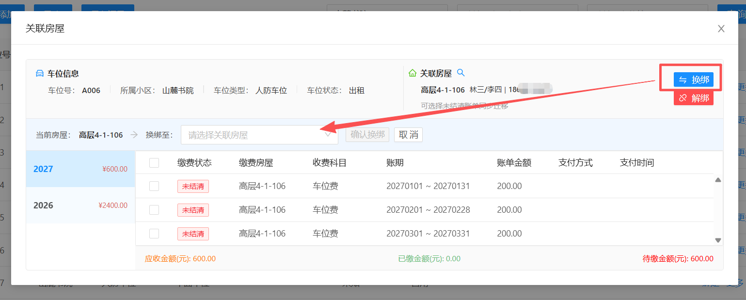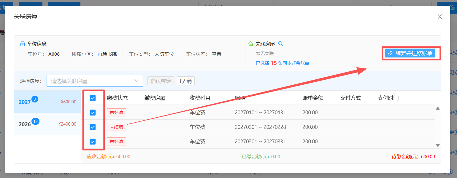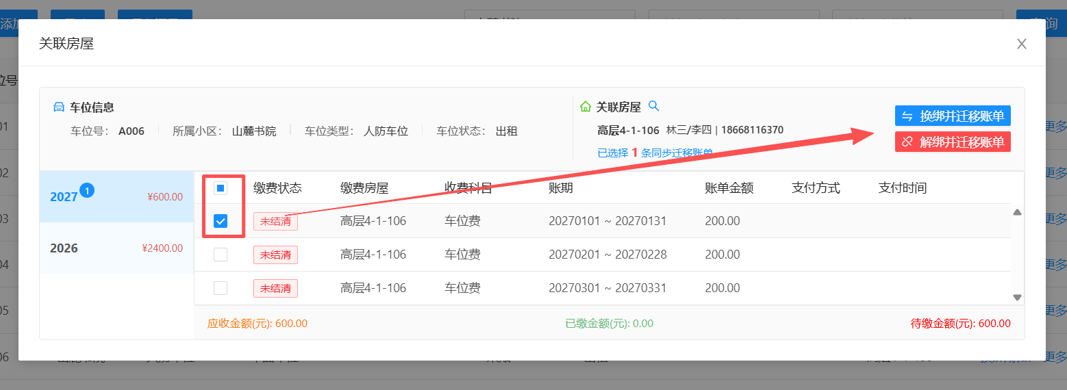 # 一、功能介绍 您可在当前页面查看并管理车位,支持添加/导入车位、换绑/解绑房屋并迁移车位账单。 功能路径:数据中心 -》车位管理。 # 二、车位导入 1. 先点击 **导入** ,然后点击 **下载模板** ,并按照模板内容整理资料。 3. 整理完成后,点击 **选择文件** ,导入您刚刚整理好的资料。  # 三、单独添加车位 点击**添加**,输入车位信息后点击确定后即可添加。 # 四、绑定、换绑、解绑房屋 在当前页面,未关联房屋的车位可绑定房屋,已关联房屋的车位可换绑、解绑房屋。 ## (一)绑定房屋 为车位绑定房屋时,若车位下存在账单,将出现以下两种场景: ### 场景一 * 车位需与房屋关联,但车位下的账单无需与房屋关联。此时直接点击 **绑定** ,选择对应的房屋即可。  --- ### 场景二 车位下的账单需与车位一同绑定至房屋。操作步骤如下: * 先勾选需要绑定的账单 * 再点击**绑定并迁移账单** * 选择对应的房屋 完成后,该车位下的账单将关联至所选房屋。  --- ## (二)换绑、解绑房屋 当前车位已关联房屋,但需换绑或解绑时,同样分为两种场景: ### 场景一 * 车位换绑/解绑房屋,但车位下的账单无需变更关联。此时直接点击**换绑/解绑**即可。  --- ### 场景二 * 车位账单需与车位一同换绑/解绑房屋。操作步骤如下: * 先勾选需要操作的账单 * 再执行解绑或换绑操作 `解绑并迁移账单:车位与房屋解绑,同时账单从该房屋移除,将单独归属于当前车位。`  --- ## (三)单独迁移账单 * 当勾选的账单其缴费房屋与关联房屋不一致时,将出现**单独迁移账单**按钮。 * 点击**单独迁移账单**后,系统将根据当前关联房屋的状态进行迁移: * 如下图所示,账单将迁移至当前关联房屋下; * 若当前车位未关联房屋,账单将迁移至车位下。   --- # 三、编辑、删除车位 点击 **更多** ,可编辑车位信息或删除当前车位。 `当车位下存在账单时,请谨慎删除。车位账单不会随车位一同删除。`