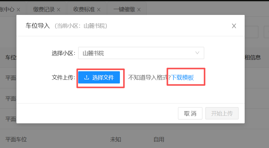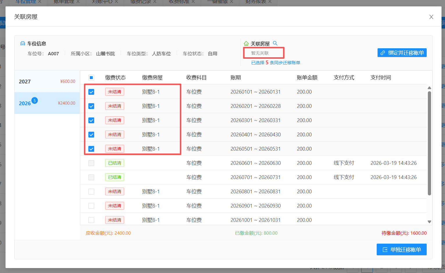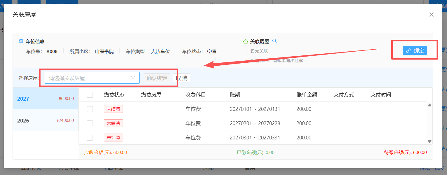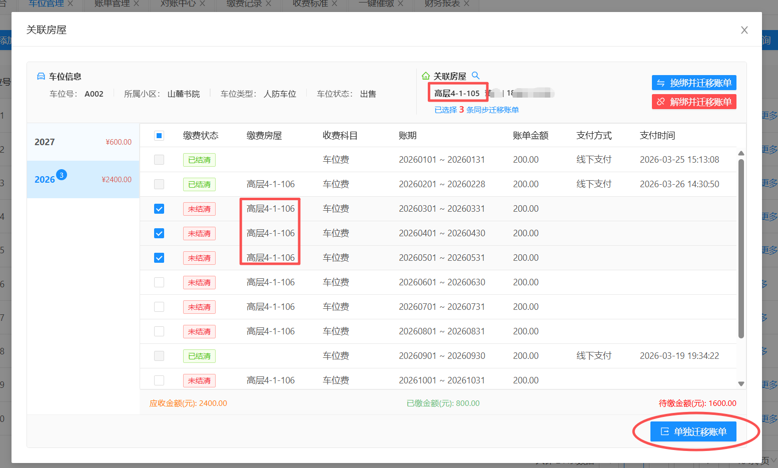 # 一、功能介绍 您可在当前页面查看并管理车位,支持添加/导入车位、换绑/解绑房屋并迁移车位账单。 功能路径:数据中心 -》车位管理。 # 二、车位导入 1. 先点击 **导入** ,然后点击 **下载模板** ,并按照模板内容整理资料。 3. 整理完成后,点击 **选择文件** ,导入您刚刚整理好的资料。  # 三、单独添加车位 点击**添加**,输入车位信息后点击确定后即可添加。 # 四、绑定、换绑、解绑房屋 在当前页面,未关联房屋的车位可绑定房屋,已关联房屋的车位可换绑、解绑房屋。 ## (一)绑定房屋 为车位绑定房屋时,若车位下存在账单,将出现以下两种场景: ### 场景一 * 车位需与房屋关联,但车位下的账单无需与房屋关联。此时直接点击 **绑定** ,选择对应的房屋即可。  --- ### 场景二 车位下的账单需与车位一同绑定至房屋。操作步骤如下: * 先勾选需要绑定的账单 * 再点击**绑定并迁移账单** * 选择对应的房屋 完成后,该车位下的账单将关联至所选房屋。  --- ## (二)换绑、解绑房屋 当前车位已关联房屋,但需换绑或解绑时,同样分为两种场景: ### 场景一 * 车位换绑/解绑房屋,但车位下的账单无需变更关联。此时直接点击**换绑/解绑**即可。  --- ### 场景二 * 车位账单需与车位一同换绑/解绑房屋。操作步骤如下: * 先勾选需要操作的账单 * 再执行解绑或换绑操作 `解绑并迁移账单:车位与房屋解绑,同时账单从该房屋移除,将单独归属于当前车位。`  --- ## (三)单独迁移账单 * 当勾选的账单其缴费房屋与关联房屋不一致时,将出现**单独迁移账单**按钮。 * 点击**单独迁移账单**后,系统将根据当前关联房屋的状态进行迁移: * 如下图所示,账单将迁移至当前关联房屋下; * 若当前车位未关联房屋,账单将迁移至车位下。   --- # 三、编辑、删除车位 点击 **更多** ,可编辑车位信息或删除当前车位。 `当车位下存在账单时,请谨慎删除。车位账单不会随车位一同删除。`