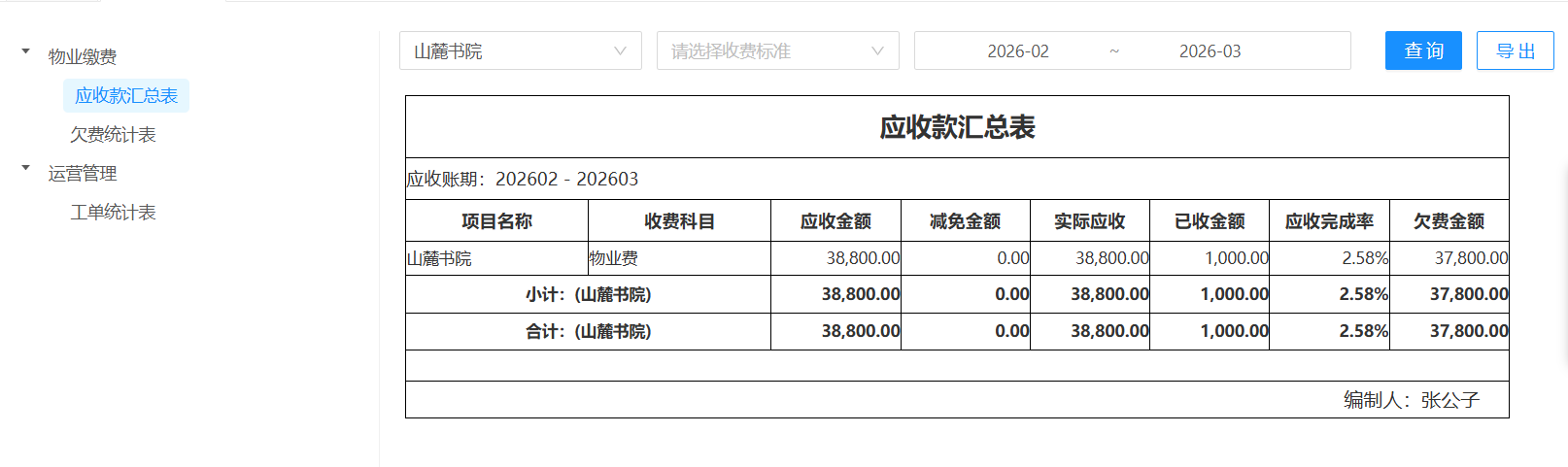 # 一、功能介绍 为方便您查看小区各类收费及缴费的金额数据,系统提供**数据报表**功能。您可按小区、收费科目、时间段等维度筛选查询,主要报表包括:应收款汇总表、欠费统计表、工单统计表等。 功能路径:数据中心 -》数据报表。 # 二、查看并导出报表 按页面提示点击 **查询** ,报表将展示在页面上。点击 **导出** ,可将当前报表以 Excel 格式导出,方便您使用。