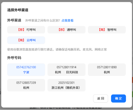 ## 1 呼叫中心介绍 ### 1.1 呼叫渠道 目前Bell呼叫中心提供了四种呼叫渠道,以下为四个渠道的一些介绍及特点,服务商可以根据自身的情况选择对应的渠道进行外呼。  【必看】管理员及话务员操作使用视频教程: 抖音:https://www.douyin.com/video/7348737949984476426 微信视频号教程请扫码进入查看:  ### 1.2 话务员外呼工作大概流程及注意 以下是话务员进行外呼工作的一般流程及注意: 1)下载“一点邻”APP,并注册账号,各大手机APP应用市场均可以下载,或者可扫码以下图片下载;  2)注册一点邻APP后,使用APP扫描登录或者账号密码登录。 系统网址:https://bell.ddlinli.com/ 请使用谷歌浏览器或微软自带Edge浏览器登录。 谷歌浏览器下载地址:https://google.cn/chrome/?system=true&standalone=1&platform=win64 3)进入系统之后,管理员有分配任务的话,在页面上就能看到相应的活动任务,点“去拨打”进入具体拨打页面。  4)拨打时,因为不同外呼渠道对应的运营商不一样,同一个号码在不同的渠道里并不会同时频次超频或在呼叫黑名单里。因此可以选择一到两遍用一个外呼渠道,再拨打时换另一个外呼渠道,多个渠道一起结合来用,效果会更好,比如,可以按以下顺序进行外呼: 第1遍,使用云呼叫 第2遍,使用叮呼叫中固话 第3遍,使用叮呼叫中手机号码 第4遍,使用叮呼叫中400号码 第5遍,使用智呼叫  ### 1.3 号码标记处理 若号码因为拨打被一些用户错误标记了,可以进入到微信公众号“码号服务平台”进行查询,然后进入相应的标记企业网站进行反馈处理。 号码标记企业 一、360手机卫士 http://haomashensu.360.cn/index.html 或拨打 01089180702 二、腾讯手机管家 https://yun.m.qq.com/content.html#1 或拨打 4006700700 三、泰迪熊移动 www.teddymobile.cn/numberComplain 或拨打 01053079235 四、电话邦 http://www.dianhua.cn/appeal 或拨打 4000618800 五、百度手机卫士 https://haoma.baidu.com 或QQ群号:725854778 六、搜狗号码通 打开微信小程序搜狗号码通"首页"输入号码查验是否被标记-如出现被标记请点击“关于"-"申诉反馈”输入号码进行提交即可。 注意事项: 1、标记消除时间:一般一周左右。 2、标记消除过程中是否需要停用:腾讯标记多的号码需要停用10-20天,其余标记号码无需停用直接消除。 3、被标记为“诈骗类”的进行消除时需要停用号码,待标记清除之后再使用。 4、泰迪熊的标记消除需要该标记号码拨打固话,流程(拨打号码01053079235,接通后根据语音提示按1,之后会提示取消时间)。 5、如申请解除标记时,被百度等平台提示“被系统识别为风险号码,解除标记审核未通过”的,号码需要停用静默10-20天之后再做尝试。 ## 2 叮呼叫 #### 2.1 叮呼叫介绍 叮呼叫为系统主要推荐拨打方式,外显号码由运营商提供,比较适合服务商中长期稳定拨打的话务员使用。 叮呼叫有两种模式: 1) 叮呼叫(SIP版):话务员通过Bell呼叫中心平台页面拨打,然后在电脑/手机上软电话软件eyeBeam/portSip/Linphone进行通话(需提前登录)。 2) 叮呼叫(网页版):话务员通过Bell呼叫中心平台页面直接拨打通话,无需使用其他软件。 #### 2.2 叮呼叫申请 服务商可通过沟通群向管理员申请,需要提供话务员的名字及手机号。 若需自定义外显号码,也可向平台工作人员申请购买。 #### 2.3 叮呼叫使用 平台工作人员进行配置分配坐席后,服务商即可通知话务员在【Bell】呼叫中心平台上选择方式后进行外呼。 坐席:暂无需购买,若该话务员已经不再工作,需要告诉平台工作人员,以便进行解绑释放坐席。 ##### 2.3.1 叮呼叫(SIP版) 若使用叮呼叫(SIP版),平台工作人员会提供SIP软件上的账号和密码及外显号码,话务员拨打前需要提前在SIP软件上登录账号。 【推荐】eyeBeam(仅支持Windows电脑) 下载地址:https://cdn.ddlinli.com/statics/applications/P008/software/sip/eyeBeam.zip PortSIP下载地址:https://www.portsip.cn/download-portsip-softphone/ linphone 下载地址:https://www.linphone.org/ - eyeBeam登录步骤: 1)解压缩下载好的压缩包,双击 eyeBeam.exe 进行安装。 2)安装好软件打开后,需要输入注册码(如果没有弹出,则可以先右键软件,即会弹出),打开直接解压缩里的 sn.txt,复制序列号输入。 3)右键软电话,选择【SIP 账号设定】-【增加】,如下图:  4)输入对应的账号密码(如果没有坐席账号和密码则联系平台方)。   5)添加完成点击确认,软件显示“就绪”即表示已经成功登录。  - PortSIP登录步骤:  用户名:工作人员提供的账号 密码:工作人员提供的密码,密码注意区分大小写,输错登录会报“Forbidden” SIP域名:39.106.153.230 同时点【高级选项】,按以下页面进行配置:  出站代理:39.106.153.230:2080 传输协议:UDP 话务员若反馈外呼电话拨打接通率不高,服务商可以反馈至平台工作人员,由工作人员进行更换外显号码,无须另外重新申请SIP软件账号(此账号实际是坐席,因此不需另外申请或更换)。 ##### 2.3.2 叮呼叫(网页版) 话务员选择叮呼叫(网页版)外呼方式后,点击确定,即可进入拨打页面进行外呼。 ## 3 通呼叫 ### 3.1 通呼叫介绍 通呼叫,需要进行双向回拨(系统拨打后,需要手机先接听再呼叫对方),比较适合第三方服务商需要经常使用自己公司的手机号码作为外显号码。优点是不像云呼叫、智呼叫等外显号码需要向运营商申请后才能使用。 目前外显号码主要支持中国电信号码。 注意:通呼叫录音回传需要4小时左右时间,偶尔有时候录音回传会丢失,需要定期检查若有丢失即