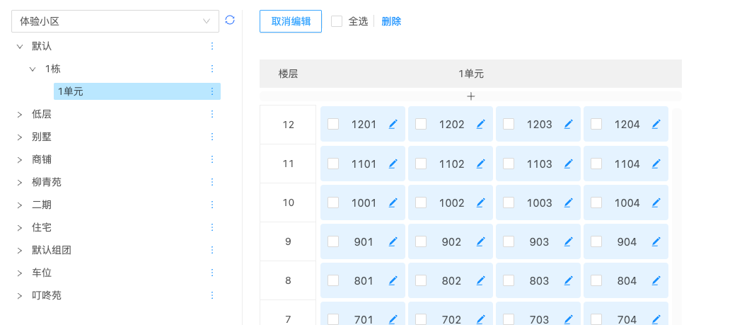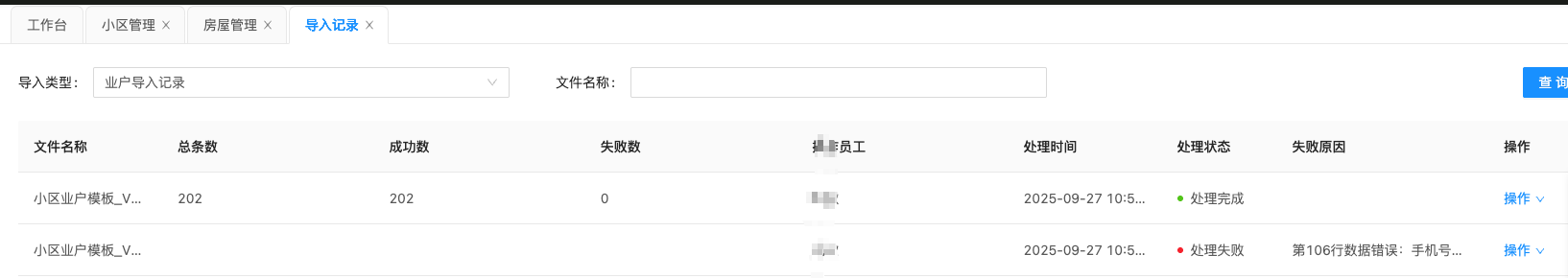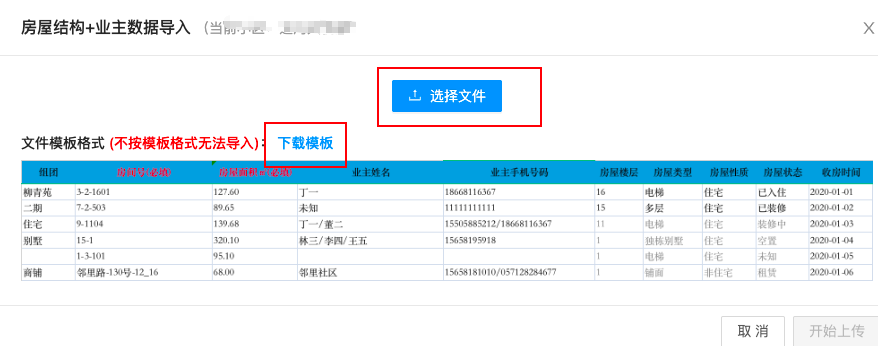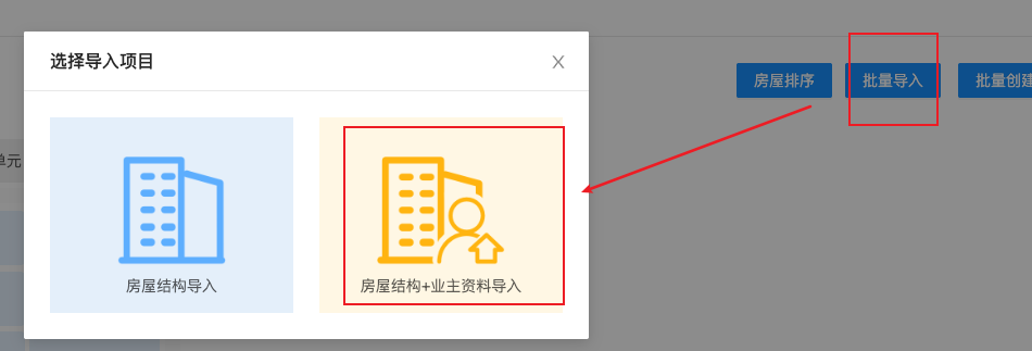 ## 一、功能介绍 该功能旨在对小区房屋楼栋进行集中管理。 功能路径:数据中心-》房屋管理。 ## 二、批量导入 **建议直接使用批量导入房屋 + 业主信息的方式来导入** 点击批量导入,选择房屋结构 + 业主资料导入  接下来点击下载模板,请按照模板的内容进行整理资料。 整理完成之后,点击选择文件导入您刚刚整理好的资料。  然后点击导入记录按钮,查看导入的情况,如果失败会有失败的详情,请按照失败原因重新整理,整理完成之后,重复之前的操作重新导入。  ## 三、编辑房屋 点击页面的编辑按钮,可以开启对于房屋信息的编辑功能,您可以修改比如面积和单元性质等信息。  ## 四、其他功能 * 房屋排序:如果您导入的资料顺序不正确,可以在这里对房屋信息进行重新的排序调整。 * 修改单元和楼栋等功能。