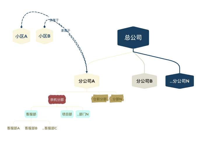 ## 一、功能介绍 该功能旨在对总公司、分公司、部门、小区归属等组织架构进行管理。 功能路径:数据中心-》组织架构。 **架构图:**  ## 二、公司、分公司管理  可以点击底部的新增公司来新增主公司和分公司。另外在每个分公司下允许添加二级子公司。  ## 三、小区归属 您可以在左边的公司旁边 点击授权小区,可以将该小区授权给某个主/分公司管辖。小区默认都是被归属于主公司。 ## 四、部门新增/修改/删除  点击任何的部门,会有菜单打开,然后进行对应的相关操作。